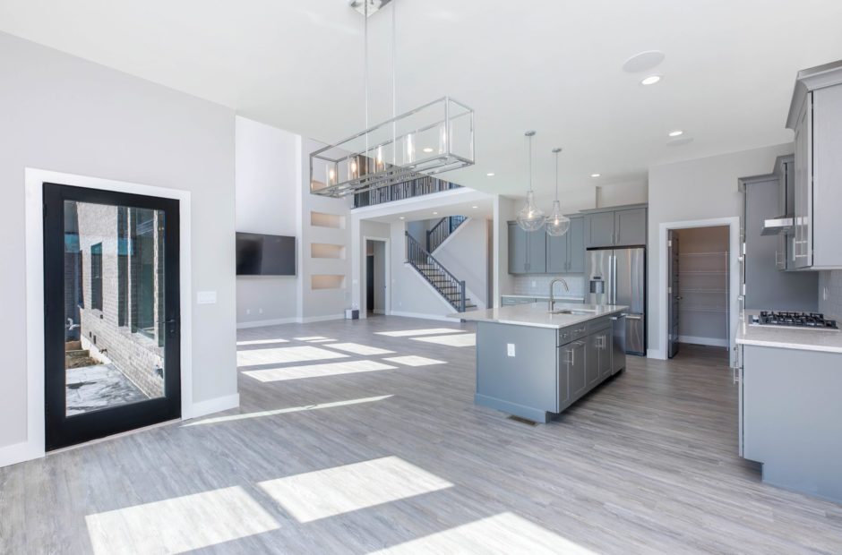 - Open-concept layout connecting the kitchen, dining area, and great room